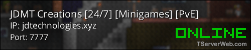 <a href="https://www.tserverweb.com/terraria-server/5235-jdmt-creations-247-minigames-pve/" target="_blank" ><img src="https://www.tserverweb.com/share-5235.png" alt="" /></a>