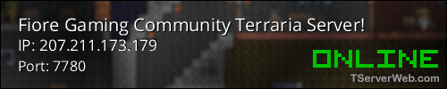<a href="https://www.tserverweb.com/terraria-server/8917-fiore-gaming-community-terraria-server/" target="_blank" ><img src="https://www.tserverweb.com/share-8917.png" alt="" /></a>